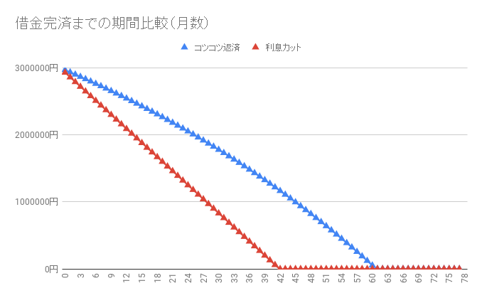 以下は、300万円を高利で借りたときに、返済額を固定して「任意整理をして利息カットをした場合(赤線)」と「普通に返した場合(青線)」の比較グラフです。
